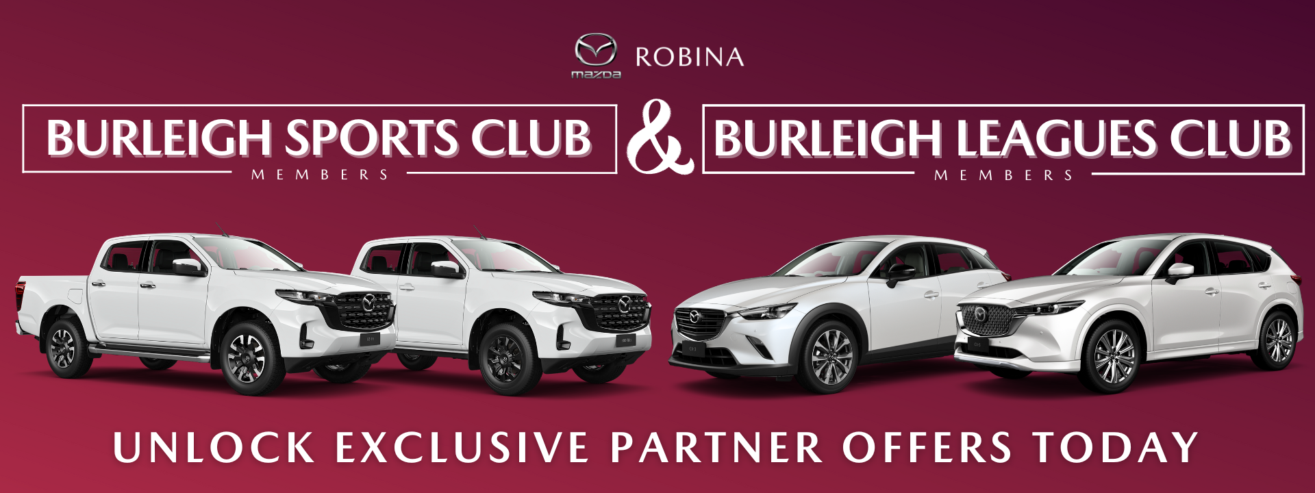 *Terms & conditions apply. Offer valid on all new Mazda vehicles purchased at Robina Mazda. Members must present a valid Burleigh Bears or Burleigh Leagues Club membership card at the point of entry into the showroom to qualify.