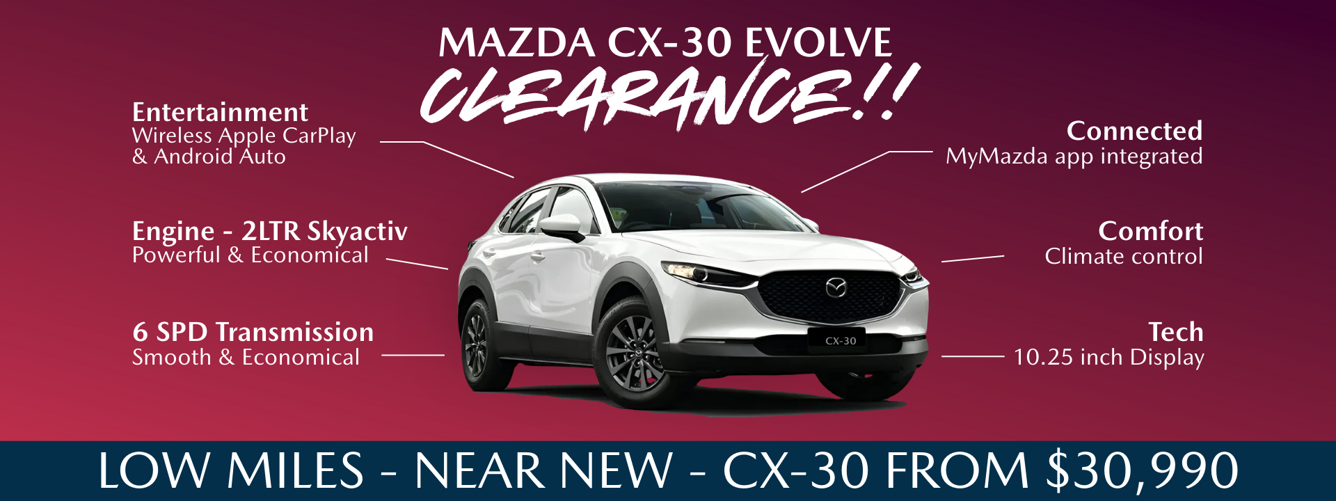 This Clearance group of Mazda CX-30 Evolve models offer exceptional value, without compromising on comfort, tech or style.