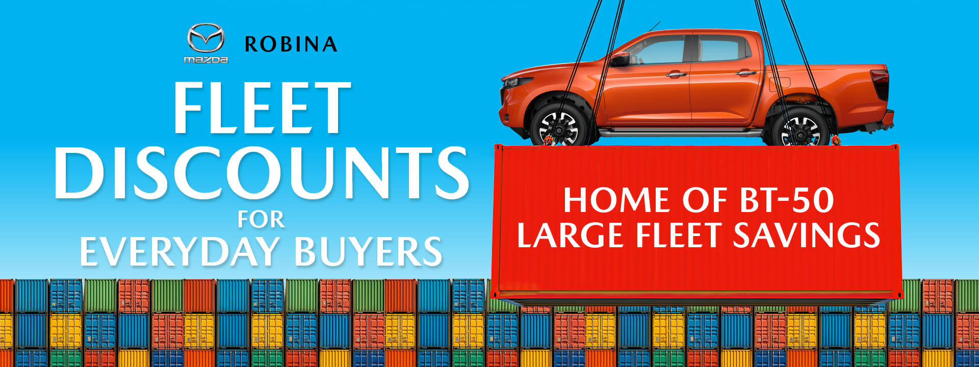 Disclaimer: Large Fleet pricing and discounts are calculated and applied from the standard retail figure and exclude any previously discounted pricing. Offer excludes demonstrator models and cannot be used in conjunction with any other offer or promotion. Savings are not transferable or redeemable for cash. Robina Mazda reserves the right to change or withdraw offers at any time without notice.