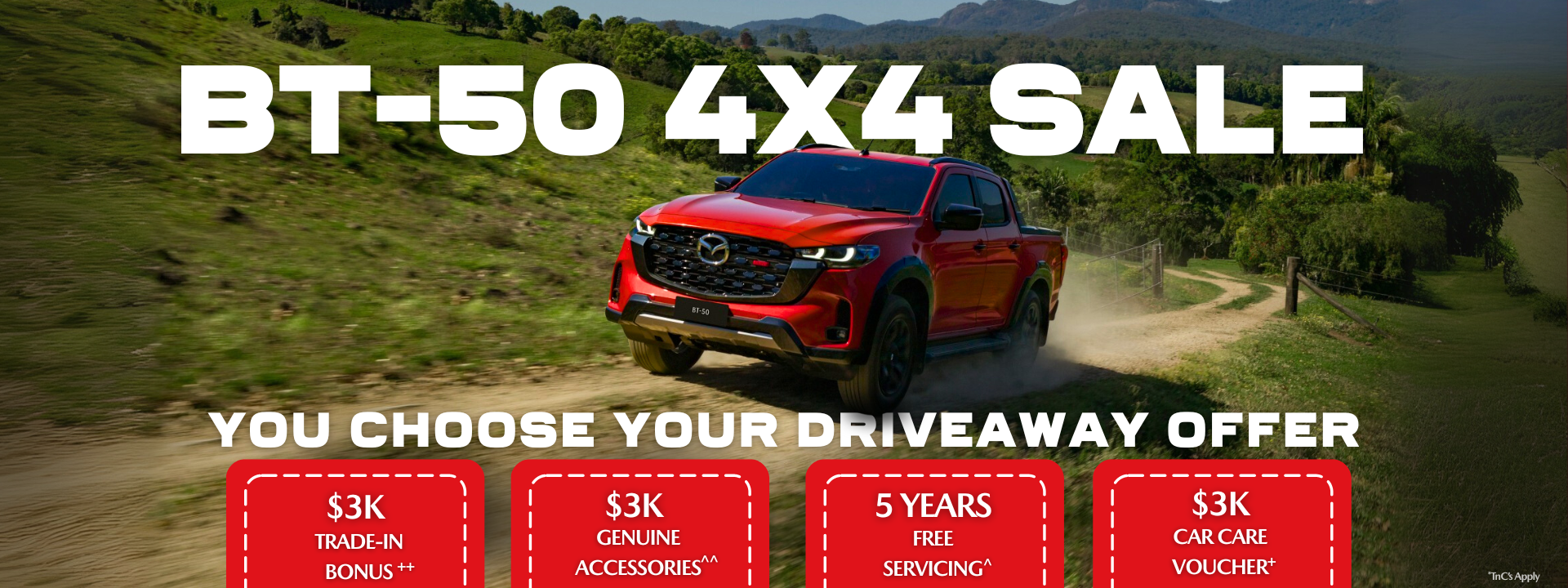 *Terms and conditions apply. Offer available while stocks last on all new 4x4 Mazda BT-50 vehicles purchased and delivered before 31.10.25 at Robina Mazda, unless extended or withdrawn earlier. Offer not available in conjunction with any other promotion. Trade-in vehicles must be roadworthy, currently registered, and drivable at the time of trade-in. Offers are not redeemable for cash and apply to private buyers only. The following offers are available; however, only one offer may be selected per vehicle purchase.